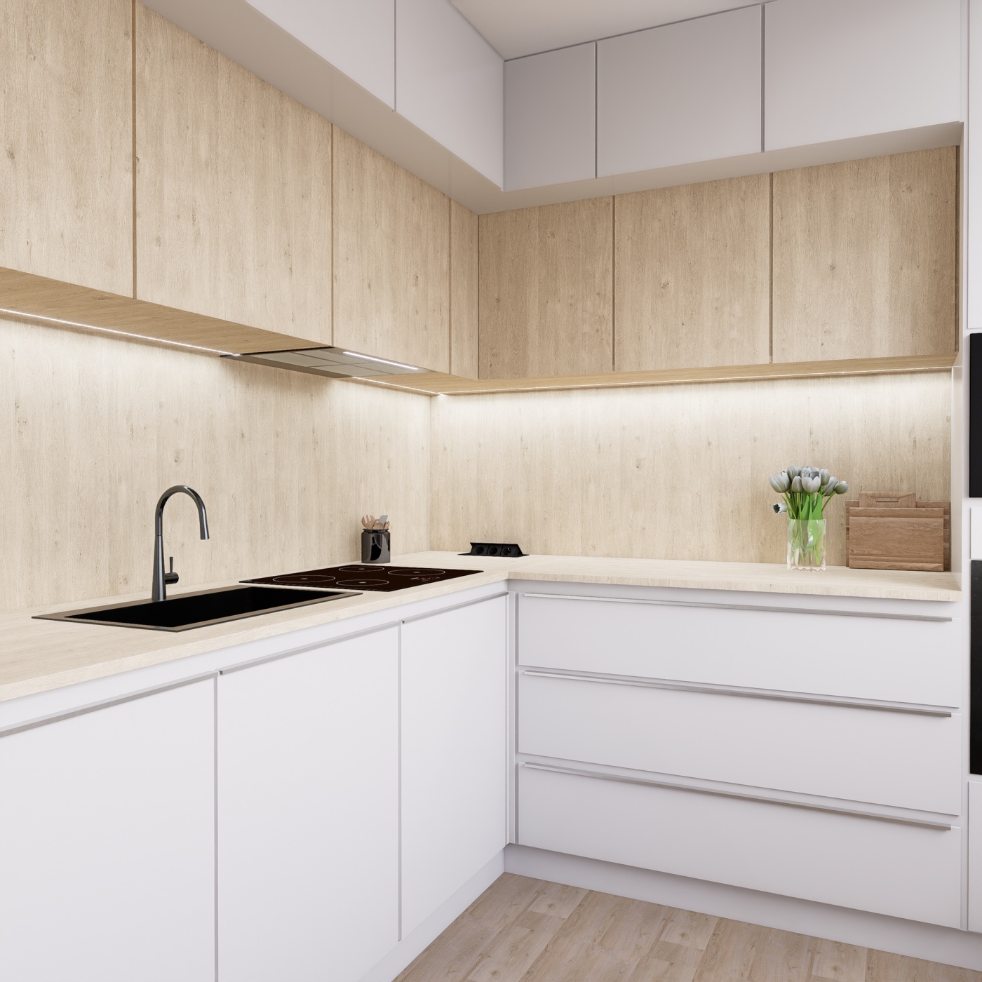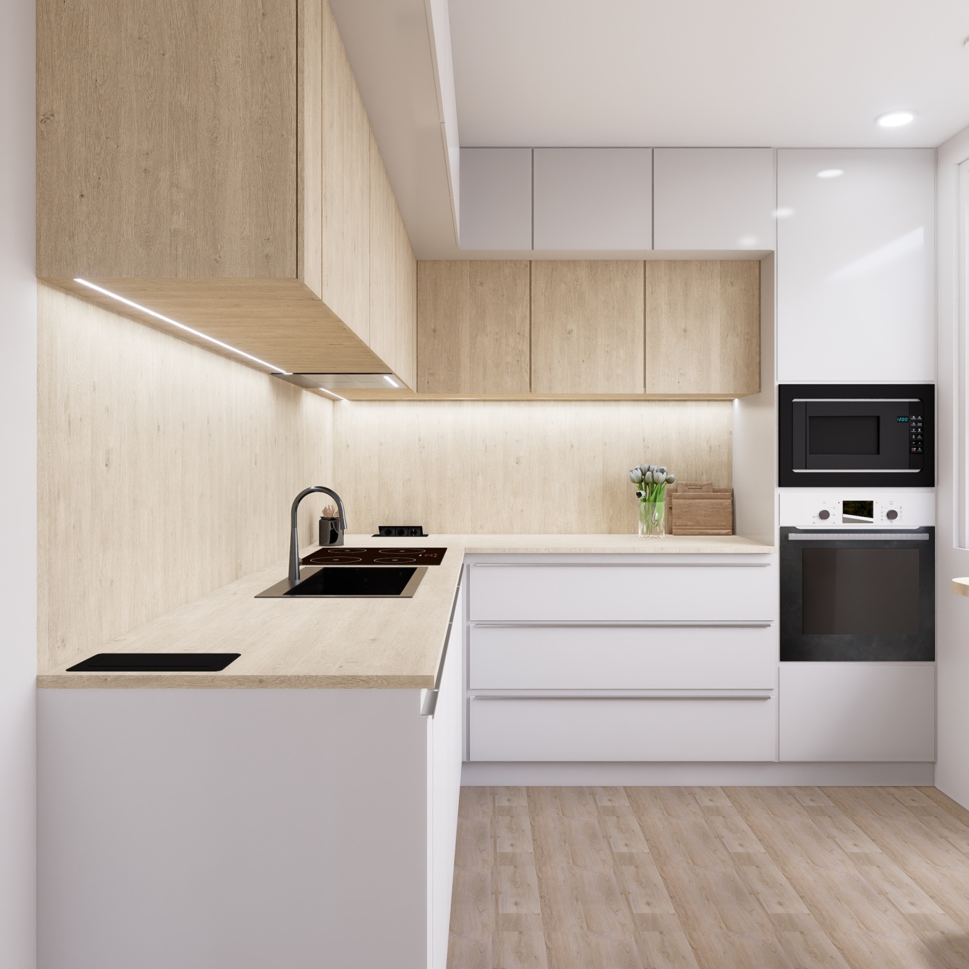 Koupelna je řešena kombinací světlých betonových dlaždic a dekoru dubového dřeva, který se objevuje i na nábytku, čímž prostor působí přirozeně, nadčasově a komfortně. Nábytek v ostatních částech bytu je převážně v čistém bílém dekoru, který spolu se světlou dubovou podlahou sjednocuje celý interiér a propojuje jednotlivé zóny. Kuchyňská linka kombinuje dubový masiv s bílým leskem, čímž spojuje estetiku s praktičností každodenního užívání. Obývací pokoj je obohacen architektonickým obloukem s podsvícením a dřevěnými lištami, které podtrhují harmonii prostoru a dodávají mu charakter.