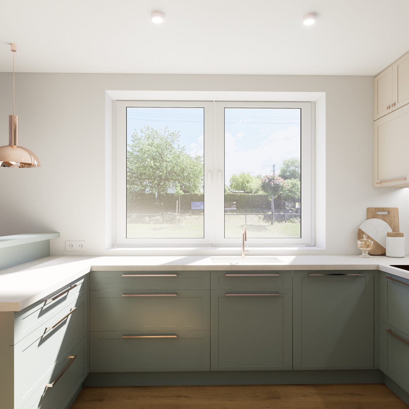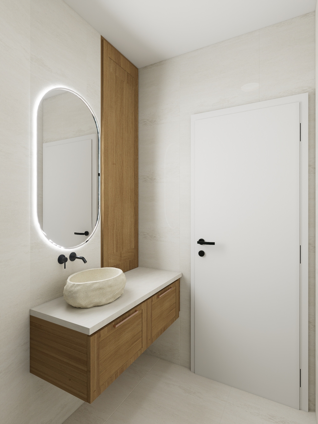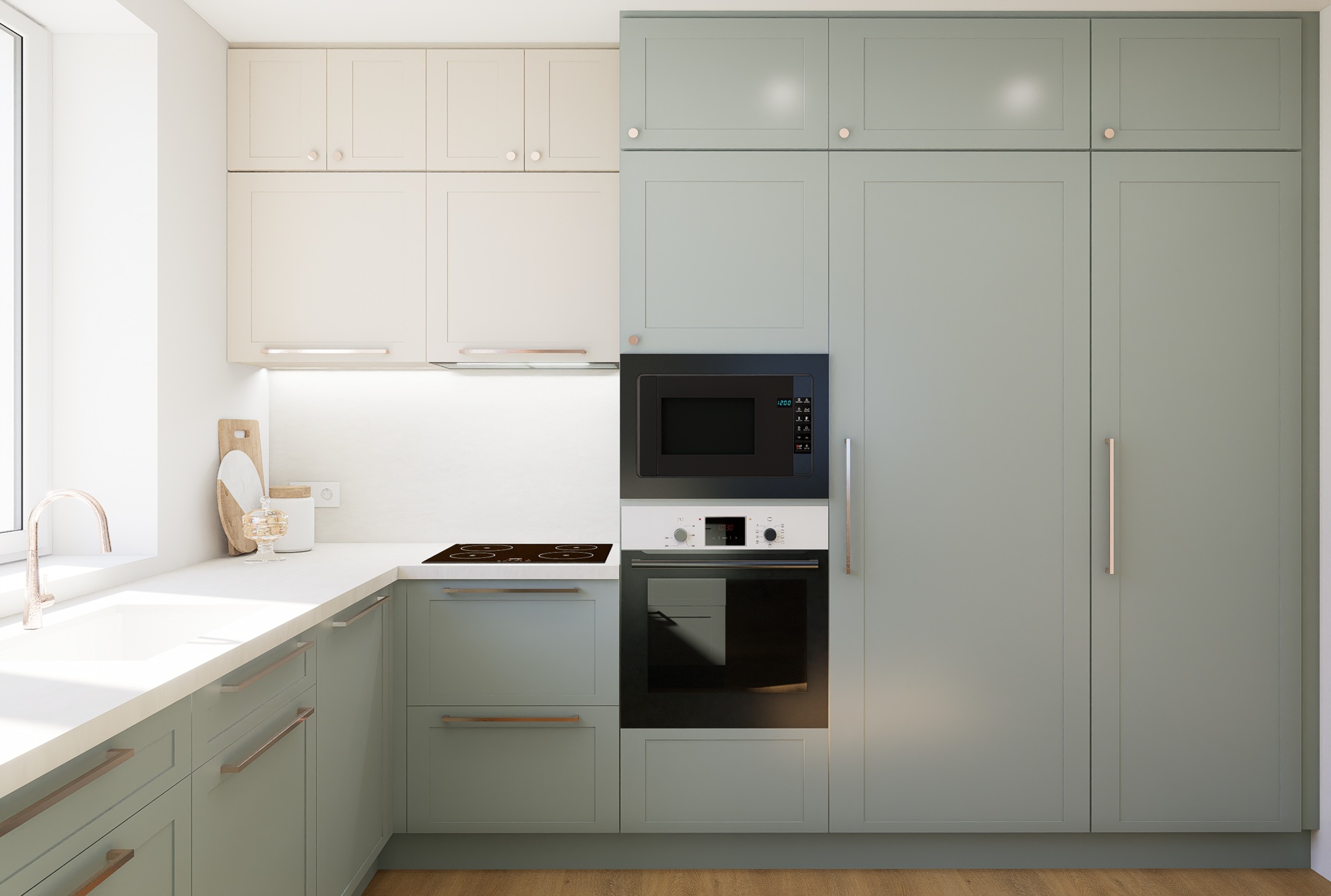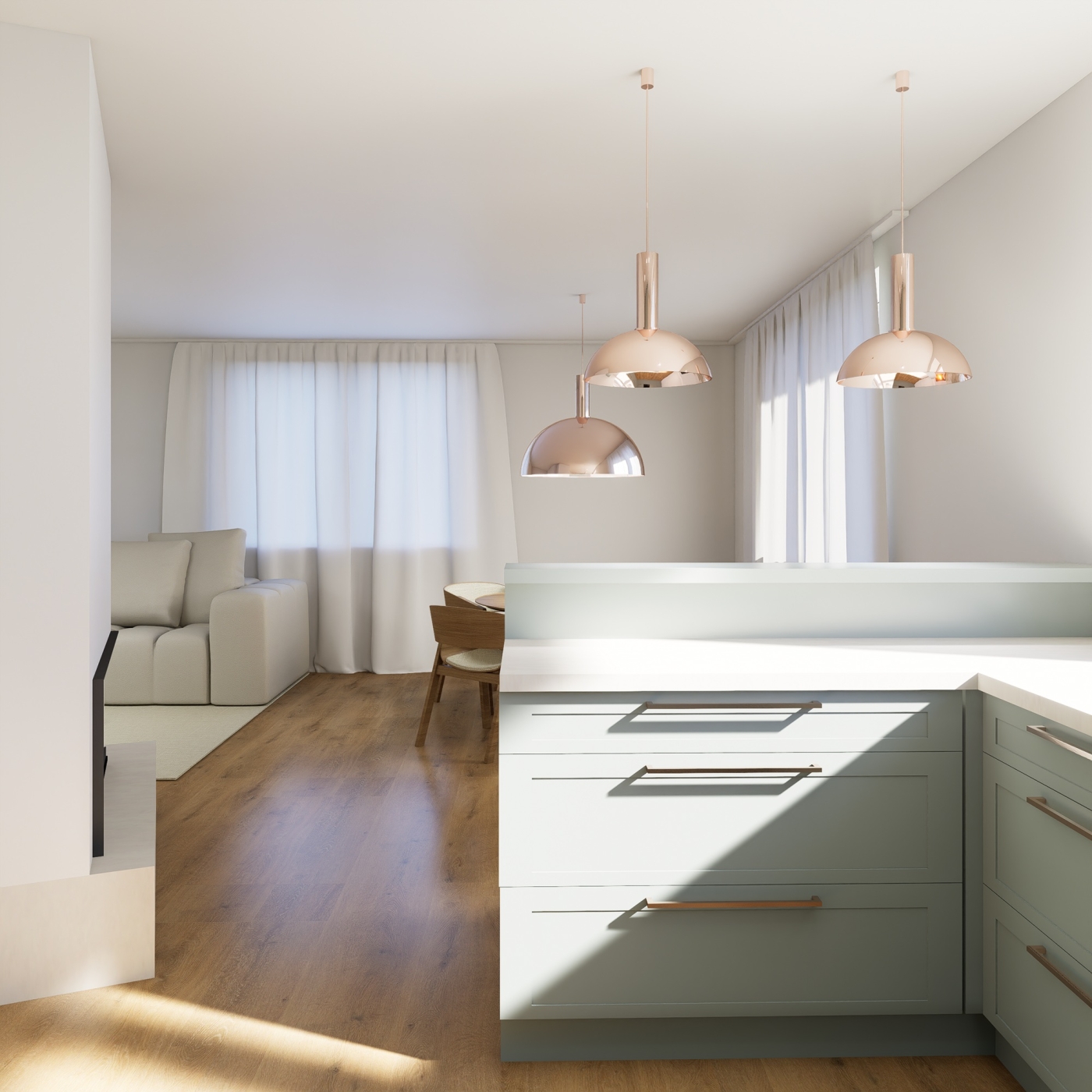 Projekt se zaměřuje na propojení kuchyňského prostoru s koupelnou a toaletou, čímž vzniká plynulý a vzdušný interiér. Dominantními prvky jsou teplé dřevěné tóny, které prostoru dodávají pocit útulnosti, a výrazná fjordská zelená, jež vytváří silný vizuální akcent a zároveň sjednocuje jednotlivé části bytu. Celkový design vychází ze snahy o jednoduchost a čisté linie, respektující představy zákaznice o harmonickém, přehledném a elegantním prostředí. Výsledkem je prostor, který působí zároveň moderně, přirozeně a útulně, s důrazem na propojení funkčnosti a estetické rovnováhy.