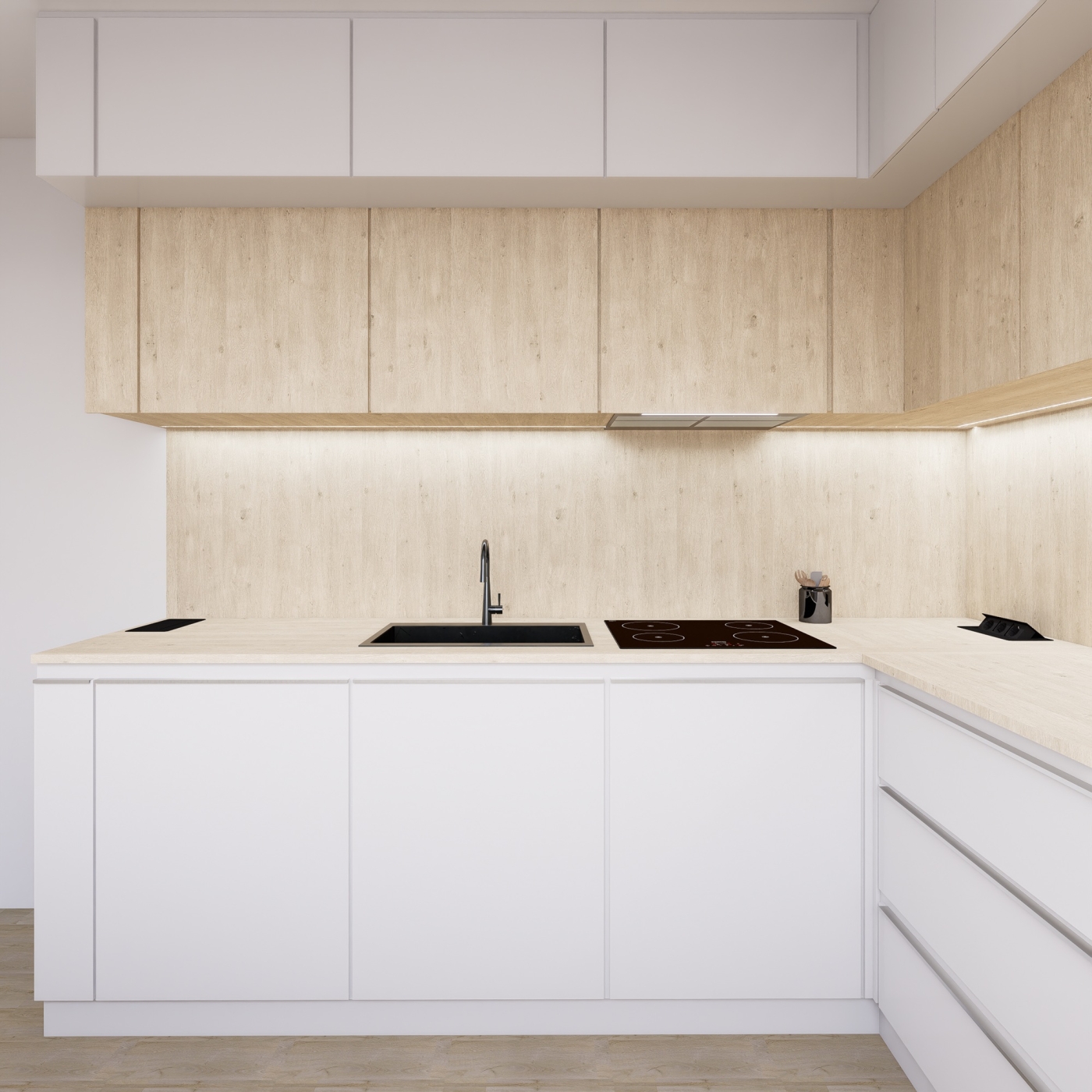 Koupelna je řešena kombinací světlých betonových dlaždic a dekoru dubového dřeva, který se objevuje i na nábytku, čímž prostor působí přirozeně, nadčasově a komfortně. Nábytek v ostatních částech bytu je převážně v čistém bílém dekoru, který spolu se světlou dubovou podlahou sjednocuje celý interiér a propojuje jednotlivé zóny. Kuchyňská linka kombinuje dubový masiv s bílým leskem, čímž spojuje estetiku s praktičností každodenního užívání. Obývací pokoj je obohacen architektonickým obloukem s podsvícením a dřevěnými lištami, které podtrhují harmonii prostoru a dodávají mu charakter.