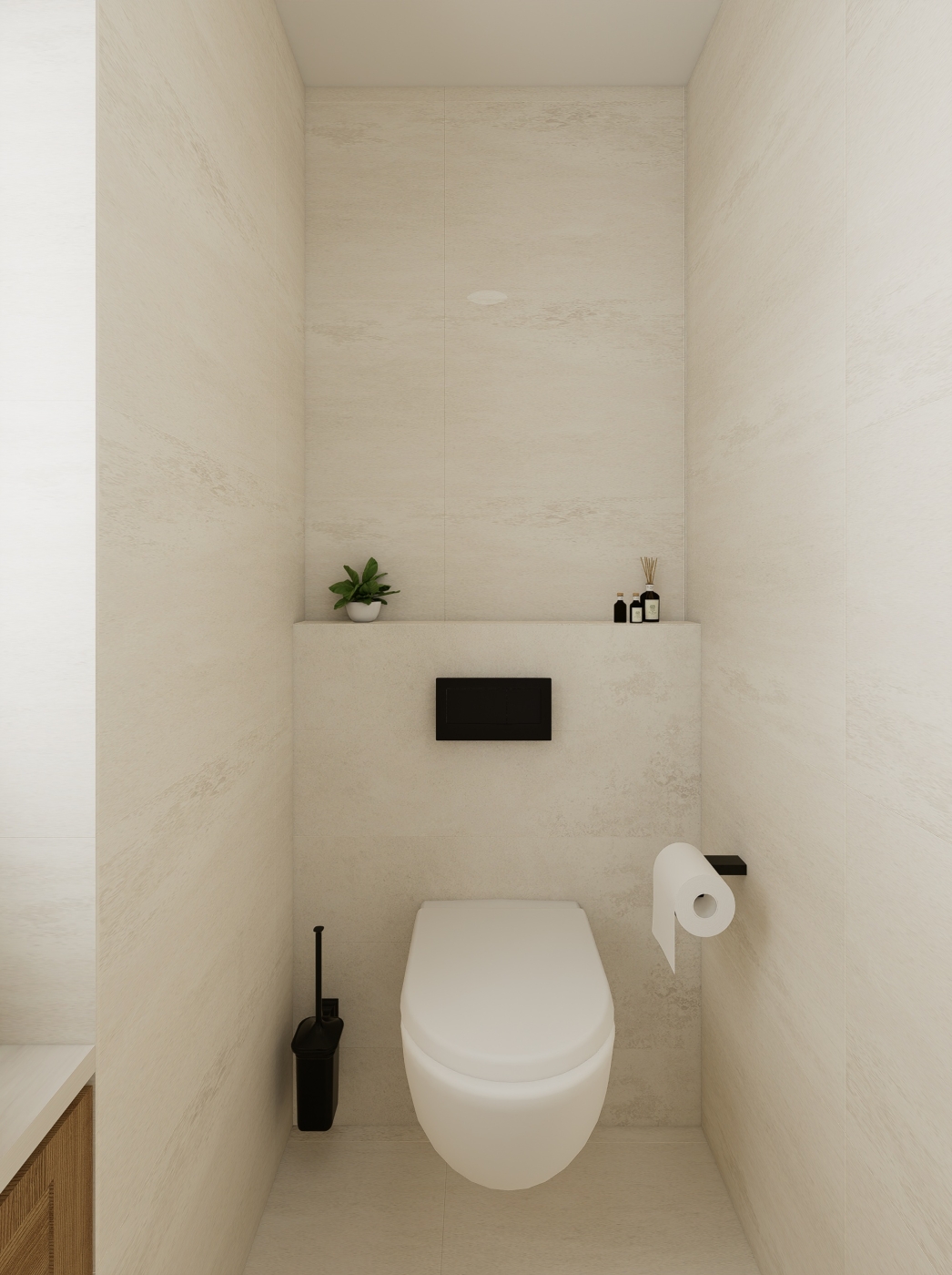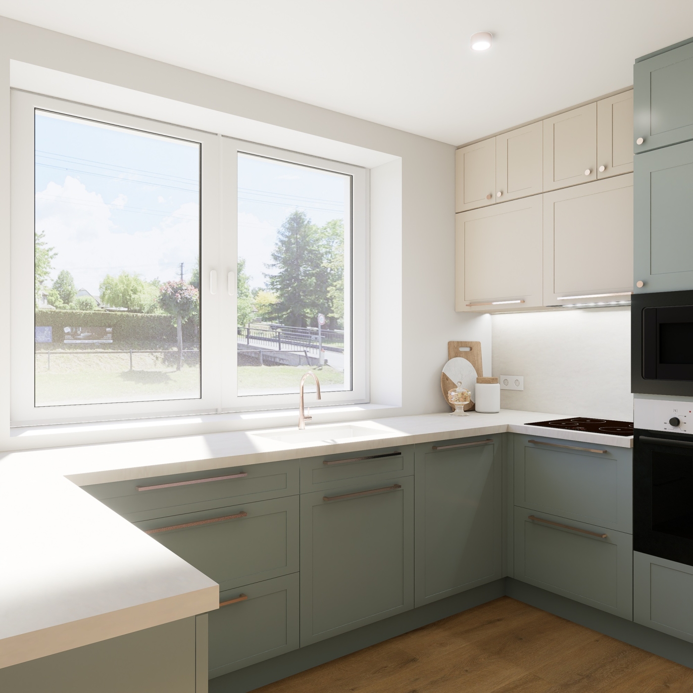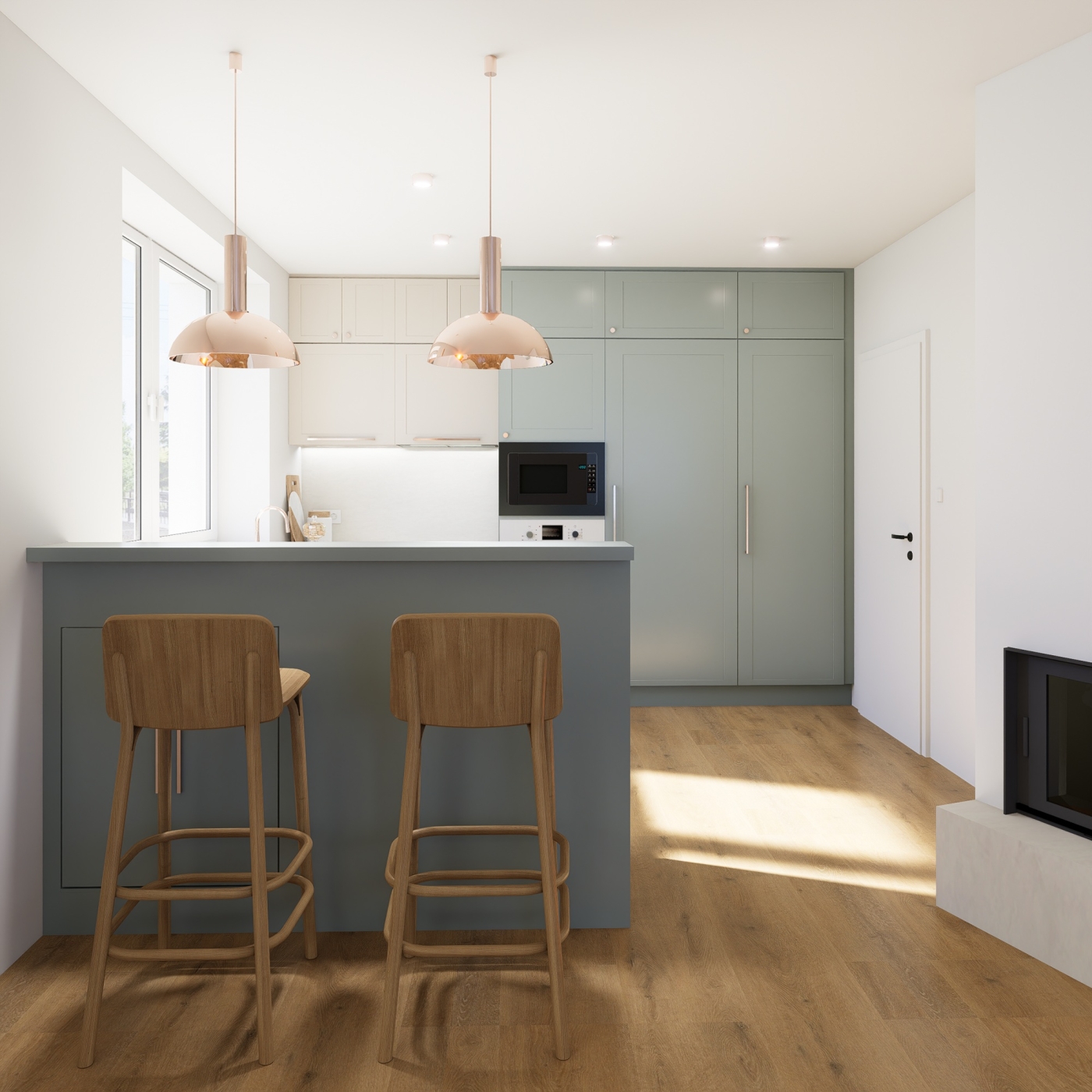 Projekt se zaměřuje na propojení kuchyňského prostoru s koupelnou a toaletou, čímž vzniká plynulý a vzdušný interiér. Dominantními prvky jsou teplé dřevěné tóny, které prostoru dodávají pocit útulnosti, a výrazná fjordská zelená, jež vytváří silný vizuální akcent a zároveň sjednocuje jednotlivé části bytu. Celkový design vychází ze snahy o jednoduchost a čisté linie, respektující představy zákaznice o harmonickém, přehledném a elegantním prostředí. Výsledkem je prostor, který působí zároveň moderně, přirozeně a útulně, s důrazem na propojení funkčnosti a estetické rovnováhy.